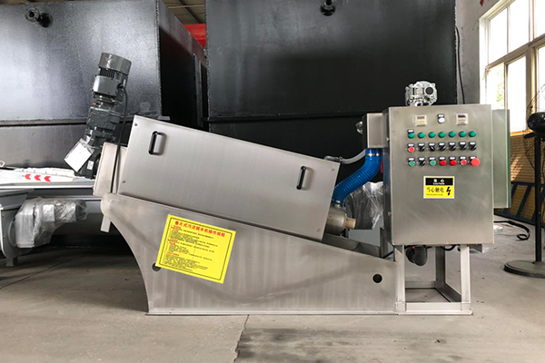 (2)、脫水:經過濃縮的污泥隨著螺旋軸的轉動不斷往前移動;沿泥餅出口方向,螺旋軸的螺距逐漸變小,環與環之間的間隙也逐漸變小,螺旋腔的體積不斷收縮;在出口處背壓板的作用下,內壓逐漸增強,在螺旋推動軸依次連續運轉推動下,污泥中的水分受擠壓排出,濾餅含固量不斷升高,最終實現污泥的連續脫水。